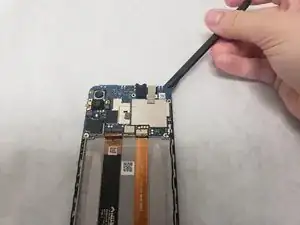 Прямо над гнездом аккумулятора отожмите пресс‑фит разъём на конце оранжевой шлейфа справа.