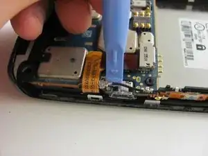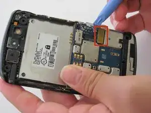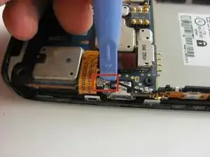 Найдите красный шлейф с язычком, подключённый к материнской плате. Он расположен справа на задней стороне телефона.