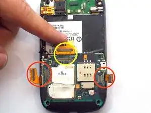 Кабель, окруженный желтым, приклеен к серебристой крышке. Потяните шлейф вверх к области аккумулятора.