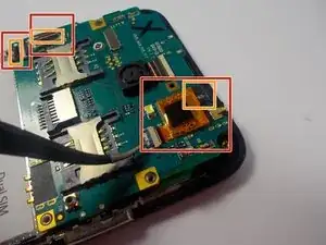 С помощью пинцета поднимите защёлки в местах подключения кабелей — это разблокирует кабели. Кабели легко выскользнут из разъёмов при разблокировке. Тяните за провод пинцетом, как показано на фото.