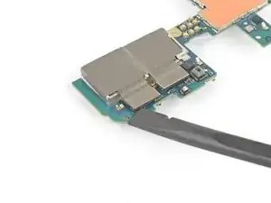 Вставьте кончик лопатки в зазор между материнской платой и средним каркасом рядом с фронтальными камерами, чтобы освободить её из первой защёлки.