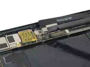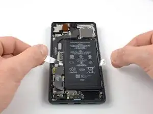 Используйте пинцет, чтобы аккуратно снять верхнюю графитовую фольгу с батареи и средней рамки.