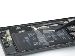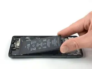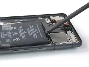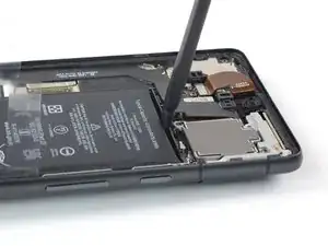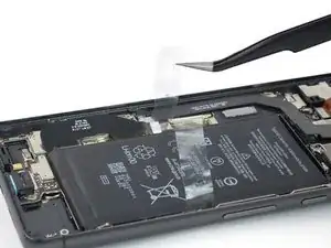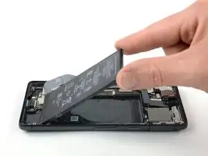 Для замены материнской платы в Google Pixel 7 необходимо извлечь аккумулятор. Не используйте повторно аккумулятор, если он деформирован или повреждён, так как это представляет опасность. Замените его на новый аккумулятор.
