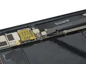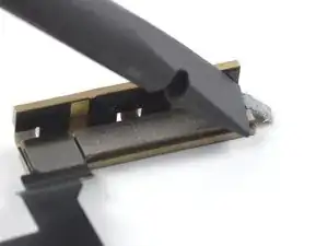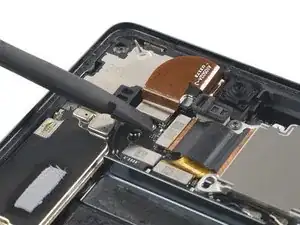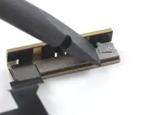 Используйте лопатку, чтобы отключить гибкий кабель дисплея, аккуратно поддев разъём и вынимая его прямо вверх из гнезда.