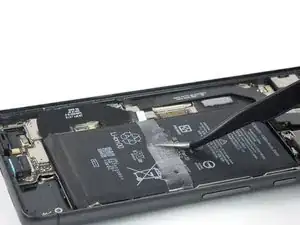 Снимите чёрную силиконовую прокладку с батареи и средней рамки с помощью пинцета.