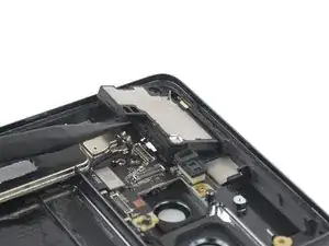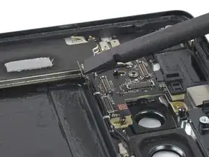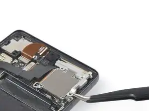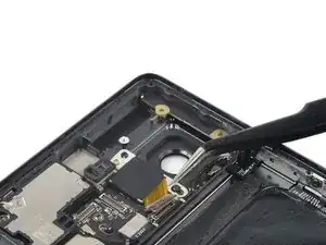 Используйте пинцет, чтобы удалить кронштейн шлейфа дисплея, потянув его из-под средней рамки в направлении камер.
