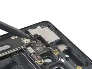 Используйте лопатку, чтобы отключить кабель ультра‑широкоугольной камеры, поддев разъём прямо вверх из его гнезда.