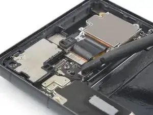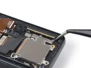 Используйте медиатор, чтобы отключить кабель mmWave‑антенны, отгибая разъём прямо вверх из его гнезда.