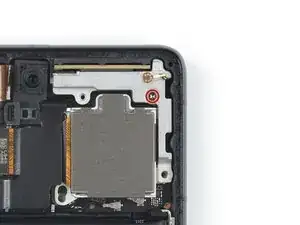 Используйте отвёртку Torx T3, чтобы выкрутить винт длиной 5,1 мм, закрепляющий слуховой динамик.