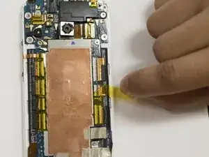Пинцетом удалите маленькие кусочки жёлтой ленты, которые фиксируют телефон.
