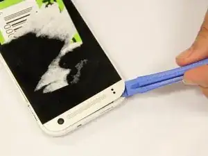 Используйте пластиковую лопатку, чтобы отщёлкнуть заднюю крышку. Вставьте инструмент в посадочное место для SIM-карты и с усилием снимите заднюю крышку. Продолжайте по всему периметру телефона.