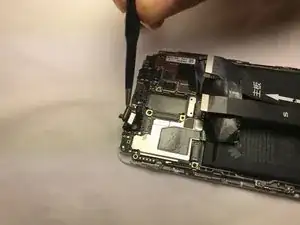 Вставьте медиатор при подъёме дисплейного модуля от задней крышки и одновременно проводите медиатором по краю телефона, чтобы ослабить крепление дисплейного модуля.