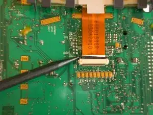 С помощью пластикового инструмента для раскрытия выдавите чёрный зажим, удерживающий ленточный кабель, из его направляющей.