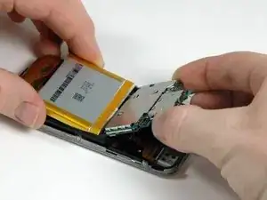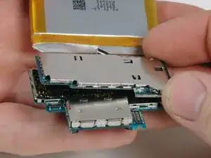 Удерживая одновременно аккумулятор и узел платы логики, сдвиньте обе детали в сторону от орантовой антенны и выньте их из iPhone.