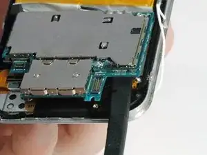 Аналогичным образом вставьте лопатку под материнскую плату в месте, где была камера. Опять же, пока не поднимайте слишком высоко, так как снизу материнской платы всё ещё подключены четыре разъёма.