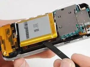 Работая от края, противоположного разъёмам батареи, вставьте лопатку между батареей и пластиковым каркасом и подденьте батарею. Она приклеена к корпусу, но должна постепенно отойти.