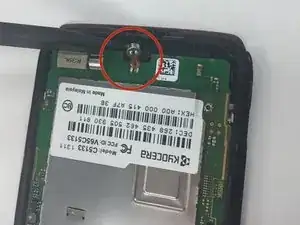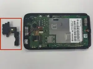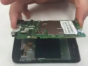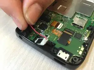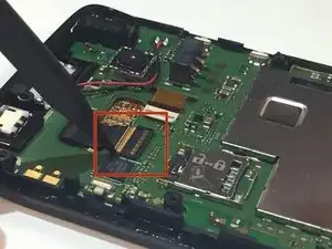 Найдите защёлку в нижней части телефона. С помощью лопатки отщёлкните защёлку, соединяющую материнскую плату с передней частью телефона.