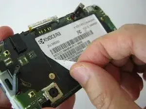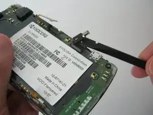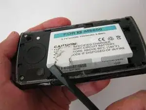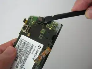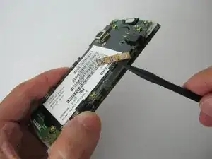 Используйте пластиковую лопатку, чтобы поднять аккумулятор за паз в его верхнем левом углу.