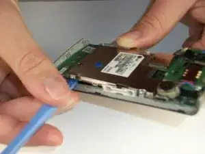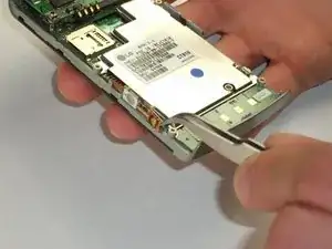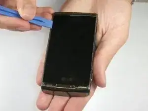 Положив винты в сторону, вставьте пластиковый инструмент для вскрытия между экраном и рамкой корпуса. Аккуратно ведите инструмент вдоль кромки, чтобы ослабить крепление экрана к корпусу. Повторите то же на другой стороне. На этом этапе экран и корпус не полностью отделятся друг от друга.