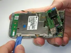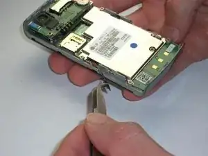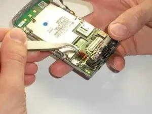 Чтобы получить доступ к третьей защелке, вставьте пластиковый инструмент для вскрытия под плату громкоговорителя/камеры и осторожно подденьте её. Не удаляйте плату полностью — она всё ещё подключена к материнской плате красно-черным проводом. На изображениях два и три защелка показана красным цветом.