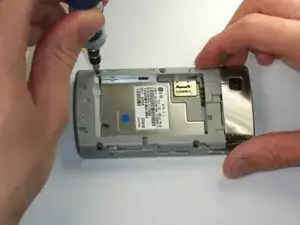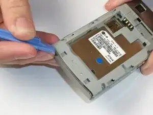 Переверните телефон задней панелью вверх. Найдите стык внизу телефона между пластиковой и металлической частями корпуса. Как в предыдущем шаге, вставьте инструмент в стык и проведите им по длине. Затем подденьте и разъедините две части. Телефон должен разделиться на две части.
