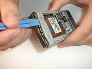 После снятия всех трех защелок пора отделить материнскую плату от другой части корпуса. Вставьте пластиковый инструмент как показано и аккуратно подденьте плату. Убедитесь, что вы ослабили крепления со всех сторон, прежде чем полностью разъединять части. На третьем изображении материнская плата слева, вторая часть корпуса справа.