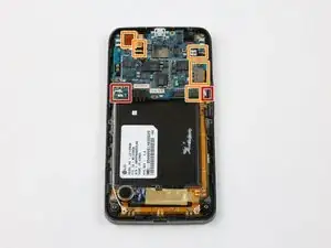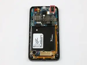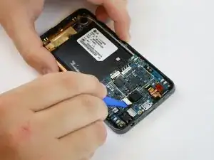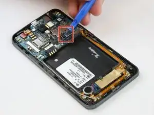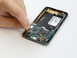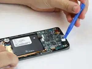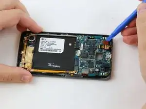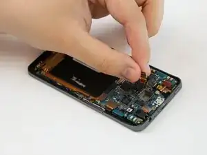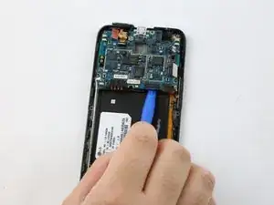 Используя либо ноготь, либо пластиковый инструмент для вскрытия, подденьте аккумулятор за вырез в левом нижнем углу и выньте его из телефона.