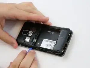 Используйте пластиковый инструмент для вскрытия, чтобы энергично поддеть пластиковую заднюю крышку по периметру телефона.