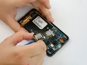 Подденьте пластиковым инструментом для вскрытия материнскую плату снизу и уверенно приподнимите её из корпуса телефона.