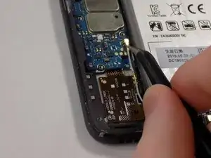 С помощью металлической лопатки подденьте материнскую плату снизу в верхней части телефона и возле батареи, чтобы вынуть материнскую плату из телефона.