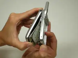 С разблокированной кнопкой возьмитесь за аккумулятор за края и потяните вверх, затем сдвиньте аккумулятор вверх, чтобы полностью удалить его из телефона.