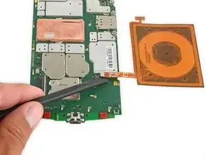 Используйте плоский конец лопатки, чтобы отключить разъём катушки беспроводной зарядки от материнской платы.