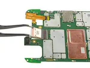 На этом этапе материнская плата снята с телефона. В следующих шагах описано удаление катушки беспроводной зарядки и обеих камер для их переноса на заменяемую материнскую плату.