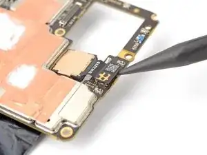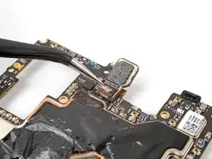 Схватите пинцетом нижний правый угол материнской платы вблизи штифта на правом краю телефона.