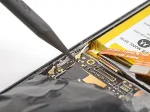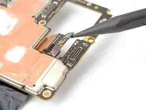 Вставьте лопатку под ленту, которая соединяет катушку беспроводной зарядки с крышкой дополнительной платы внизу справа телефона.