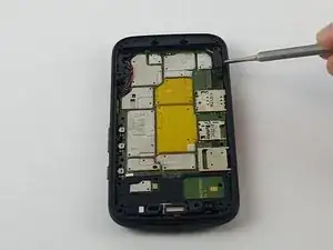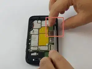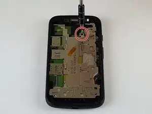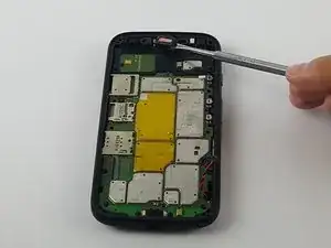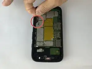После отключения кабеля батареи вставьте металлическую лопатку в маленькое отверстие рядом с динамиком и осторожно приподнимите материнскую плату настолько, чтобы между платой и корпусом телефона можно было просунуть палец.