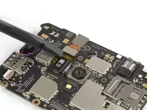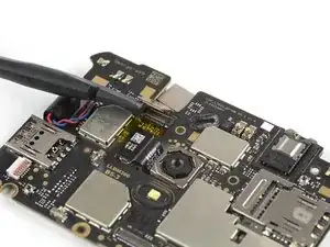 Используйте плоский конец лопатки, чтобы приподнять и отключить шлейф фронтальной камеры.