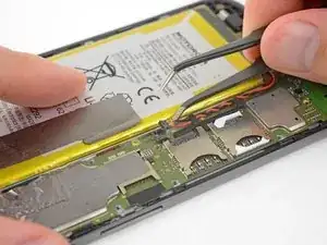 Просуньте тонкий инструмент (например, наконечник пинцета) под красный и чёрный провода батареи и проведите им под разъёмом батареи.