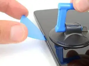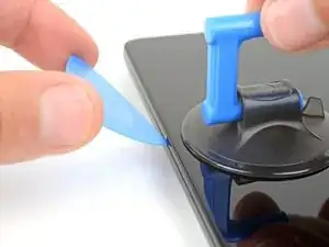 Сильным и плавным усилием потяните вверх за присоску и одновременно опустите клин под углом 45 градусов, пока он не войдёт в зазор между задней крышкой и дисплеем.