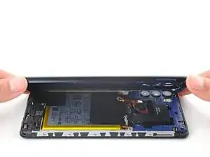 Пока нажимаете на датчик отпечатков пальцев, аккуратно поднимите нижний край задней крышки, пока датчик не отсоединится.