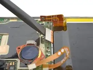 Используйте плоский конец лопатки, чтобы поднять и отключить разъём-зажим кабеля дисплея.
