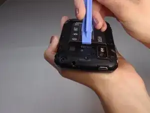 Вставьте пластиковый инструмент для открывания в углубление в нижней части телефона между передней и задней крышками.