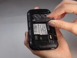 Вставьте пластиковый инструмент для открывания или палец в выемку между SIM-картой и батареей и поднимите батарею вверх.