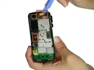 Используйте пластиковый инструмент для вскрытия, чтобы отщелкнуть два соединителя лентовых кабелей, отсоединив их от разъёмов на материнской плате.