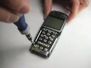 Предупреждение: Средние два винта соединены с основой телефона двумя черными пластиковыми кольцами. Осторожно удалите винты с помощью пинцета, чтобы не сломать пластиковые кольца.