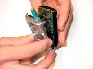 Осторожно используйте пластиковый инструмент для поддевания, чтобы отделить заднюю серебряную крышку от передней части телефона. Это может потребовать силы.