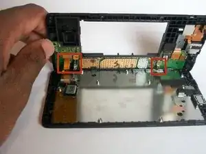 Три разъёма материнской платы для сенсорного экрана, кнопок громкости и сборки кнопки питания/блокировки экрана указаны на изображении.