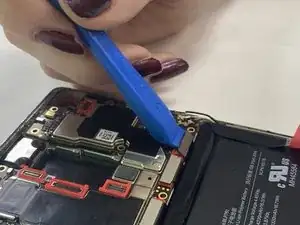 Снимите плату, аккуратно поддев её инструментом для вскрытия; приподнимите аккумулятор, чтобы облегчить извлечение.