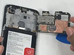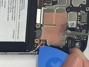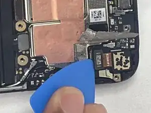 Вставьте медиатор или лопатку под золотую клипсу в правом верхнем углу телефона, чтобы отщёлкнуть материнскую плату.
