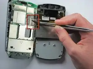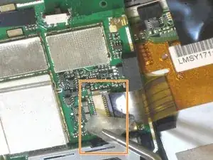 С помощью пинцета отклейте маленький кусочек ленты над разъёмом оранжевого шлейфа.